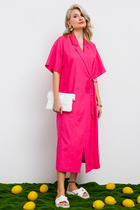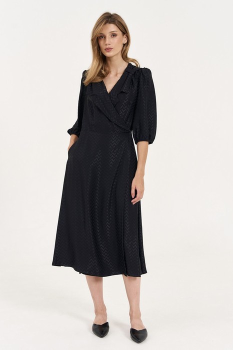 Платье лёгкое, струящееся на запахе. Отрезное по линии талии, расширенное к низу. Воротник выходящий из линии плеча, пиджачного типа, на участке воротника - декоративная перемычка создающая мягкую складку. Рукава одношевные  с узкой  резинкой по низу  и сборкой  по окату. Длина рукава до линии локтя. Застежка внешней части переда на потайную кнопку, внутренней части переда на завязку. В боковых швах карманы.  Особенностью платья платья является обработка всех внутренних швов платья окантовкой, что придает изделию элитный вид.