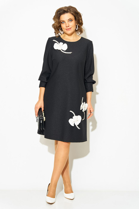 Нарядное черное платье А-силуэта – визуально вытягивает фигуру, не подчеркивая талию и придает изящность. Материал средней плотности из костюмно-плательной ткани с мерцающим эффектом. Вырез горловины округлый, в боковых швах предусмотрены карманы. Рукав вточной, с заложенными складками-за щипами по низу. Спинка с декоративным вырезом и застежкой на петлю и пуговицу. Изюминкой данной модели является шикарная аппликация в виде декоративного цветка – орхидеи украшенного бусинами и жемчугом.