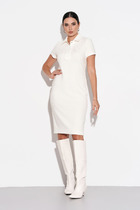 Платье приталенного силуэта, со спущенной линией плеча и объёмными рукавами со сборкой. Центральная бортовая застёжка на петли и пуговицы. Воротник пиджачного типа с отложными лацканами. По переду платья расположены талиевые вытачки и декоративные клапаны. По спинке платья  талиевые вытачки. Имеется съёмный пояс из основной ткани.