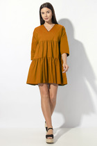Платье свободного силуэта. По переду платья нагрудные вытачки. Горловина округлой формы, обработана обтачкой. Рукав втачной, собран на пату с пуговицей. Имеется съемный пояс из основной ткани.