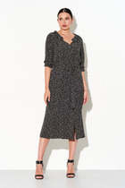 Шифоновое платье на трикотажной подкладке А-образного силуэта, длиной миди. Горловина округлой формы. Рукав втачной, разрезан посередине, низ рукава на притачной манжете, переходящей в бант-завязку.