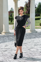 Шифоновое платье свободного силуэта на трикотажной подкладке. Горловина овальной формы, с разрезом и декоративными завязками по спинке. Платье отрезное с заниженной линией талии, с двумя широкими воланами на сборке. Рукав втачной. Низ рукава собран на эластичную тесьму.