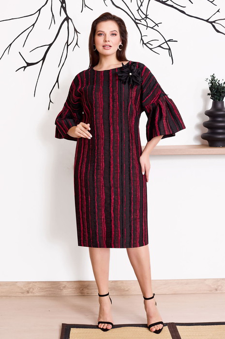 Эффектное платье футляр прямого силуэта с дизайнерскими рукавами и съемной брошью ручной работы. Платье на основе цельнокроеного покроя полуприлегающего силуэта с округлым вырезом выполнено из крешованной тафты с бархатными вплетениями, вертикальные полоски вытягивают силуэт и заужают фигуру. Перед оформлен нагрудными вытачками и украшен съемной брошью. Брошь цветок выполнена вручную из нежного шелк атласа с матовым блеском. Спинка со средним швом и талиевыми вытачками. Застежка на потайную молнию в среднем шве спинки, по низу разрез. Рукав на основе кимоно , с притачной деталью со встречными складками .