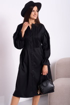 Платье с округлым вырезом горловины,фигурным низом и отрезное по талии. Верхняя часть переда платья с декоративной тесьмой. Спинка с талиевыми вытачками и застёжкой на петлю с пуговицей в верхней части. Низ платья с наложением на основную ткань сетки. Рукава втачные с манжетами по низу. Платье с потайной молнией в боковом шве.