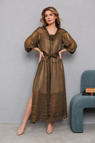 Платье приталенного силуэта выполнено из плотного трикотажного полотна. Перед платья декорирован вышивкой из пайеток. По спинке расположены талиевые вытачки. По среднему шву спинки  разрез длинной 56 см и застежка на потайную молнию. Горловина и пройма обтачные, рукав выполнен в виде "небольшого крылышка".