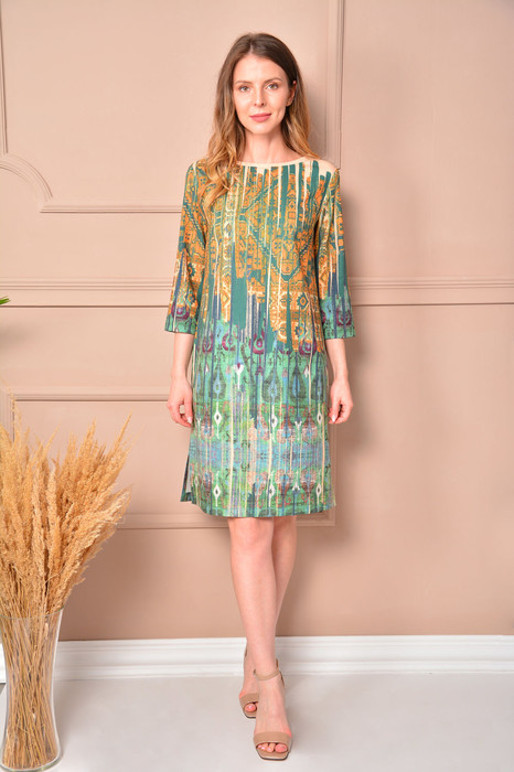 Комфортное платье прямого силуэта из трикотажного полотна длиной до колена. По переду нагрудные вытачки. Круглый вырез горловины. Застёжка-молния в среднем шве спинки. Втачные рукава, длиной 3/4. В боковых швах разрезы. Длина изделия 94 см, длина рукава 43-45