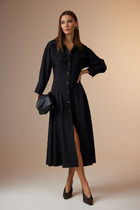 Платье свободного кроя в стиле "Бохо". Рукав реглан, по низу рукава манжеты на застёжку петлю и пуговицу. У- образный вырез горловины. По переду косые подрезы, по спинке средний шов низ платья собран на резинку.