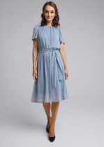 Платье полуприлегающего силуэта выполнено из шифона, по юбке трикотажная подкладка. Рукав втачной, по низу рукава манжета на застёжку петли и пуговицу. Округлый вырез горловины, воротник съёмный на завязку, по переду планка с рюшами с пришивным кружевом, застёжка на петли и пуговицы. Платье отрезное по линии талии, по спинке для удобства в носке в шов вставлена резинка. По линии талии юбка собрана на сборку.