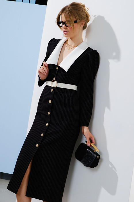 Платье прилегающего силуэта, выполнено из костюмно-плательной ткани дизайн "полоска" на трикотажной подкладке. Рукав втачной, верхняя часть рукава собрана на сборку. По горловине воротник выполнен из отделочной ткани, застёжка центральная на петли и пуговицы. По переду и спинке для облегания талевые вытачки. Пояс входит в комплектацию модели.