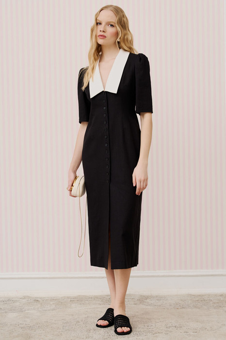 Платье прилегающего силуэта, выполнено изо льна. Рукав втачной, короткий, верхняя часть рукава собрана на сборку. По горловине отстегивающийся воротник, выполненный из отделочной хлопковой ткани, застёжка центральная на петли и пуговицы. По переду и спинке для облегания талевые вытачки.