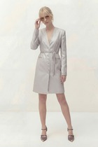 Платье полуприлегающего силуэта на подкладке. Рукав длинный втачной, по по переднему шву разрез. Y-образный вырез горловины. Застежка центральная на петли и пуговицы. По спинке средний шов и выточки. Пояс ручной работы, декорирован цепью и входит в состав платья.