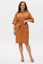 Женственное платье прямого силуэта выполнено из трикотажного полотна. Округлая горловина. Длинный втачной рукав со спущенным плечом. Перед дополнен застроченными складками. Низ ровный, сзади разрез.