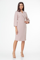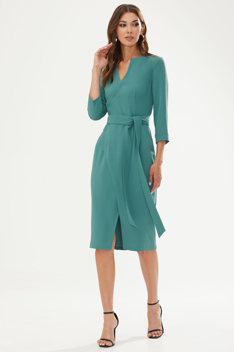 Стильное платье из плательной струящейся ткани прилегающего силуэта. Горловина фигурной формы. По среднему шву спинки потайная молния. Перед отрезной по линии талии. Лиф переда с талиевыми вытачками и имитацией запаха. Юбка переда с талиевыми вытачками и декоративным запахом. Спинка с вытачками по талии. Рукав втачной длиной 3/4. В комплект входит съемный пояс.