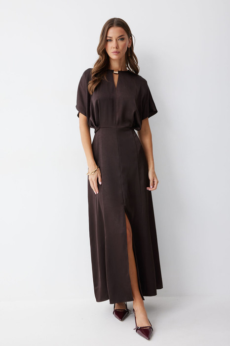 Нарядное платье из струящейся ткани длины макси. Рукав цельнокроеный. Платье отрезное по линии талии, на полочке заложены складки. Горловина округлая, с декоративно протяжкой по центру. По спинке средний шов с застежкой на потайную молнию. Юбка расширенна книзу от бедра. Обращаем ваше внимание, что фурнитура может незначительно отличаться от фото.