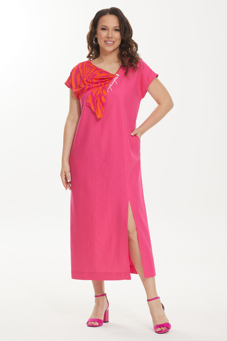 Яркое летнее платье из натуральной смесовой ткани. Платье свободного прямого кроя с коротким цельнокроеным рукавом.  Горловина с V- образом, слегка смещенным, вырезом. Обработана пришивным элементом из яркого штапеля (100% вискоза) в виде крыльев бабочки.  В боковых швах расположены удобные карманы.  Спереди слева расположен разрез. Длина платья от плечевого шва 129см. Длина рукава 15см.