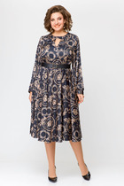 Платье полуприлегающего силуэта, длиной до колена. На центральной двубортной застёжке на 4 петли и пуговицы, отрезное по линии талии. Перед с талиевыми вытачками и наклонно настроченными клапанами из отделочной ткани. Спинка со средним швом и талиевыми вытачками. Воротник пиджачного типа из отделочной ткани. Рукав втачной двухшовный, длинный.