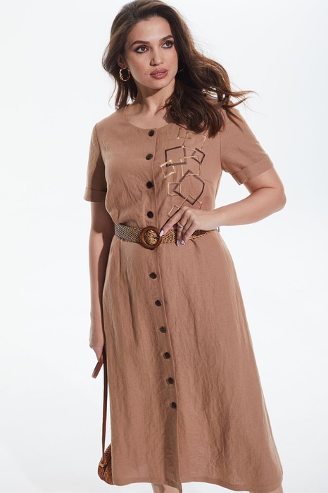Платье женское отрезное по линии талии, расширенное книзу по центральной застежке на петли и пуговицы. Перед с нагрудными вытачками и вышивкой с левой стороны в области груди. В боковых швах - карманы. Спинка со средним швом по нижней части. Горловина округлой формы, слегка углублена. Рукав втачной одношовный, короткий с отложной манжетой по низу. Платье в комплекте с декоративным ремнём.