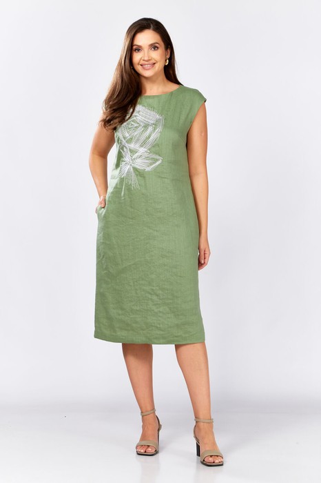 Платье полуприлегающего силуэта, слегка расширенное к низу. Спинка со средним швом. По переду нагрудные вытачки и декоративная вышивка  контрастной нитью. Горловина округлой формы. Плечо спущенное.В боковых швах карманы.