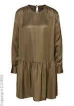 Модель с отрезной линией по талии и съемным поясом красиво подчеркивает женственность и стройность. Рукава 3/4 с аккуратными манжетами по низу добавляют образу изящества и внутренней гармонии. Прямой, немного зауженный к низу силуэт с небольшим разрезом — создаёт баланс между элегантностью и практичностью.