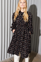 Эффектное, нарядное платье полу-прилегающего силуэта, выполнено из текстиля и велюра с эффектом меха. Горловина округлой формы, на обтачке, по полочке выполнен вертикальный подрез, по линии груди горизонтальный подрез. Рукав выполнен из отделочной ткани, втачной, на спущенной пройме. По линии талии съемный пояс из основной ткани, пряжка обтяжная из декоративной ткани. Спинка из основной ткани, со средним швом и вытачками. Эффектное и стильное платье прекрасно не только для торжественных мероприятий, но и для деловых встреч.