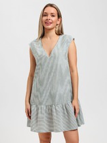 Элегантное женское платье полу-прилегающего силуэта, выполнено из плиссированной ткани, на трикотажной подкладке. Горловина платья V-образной формы, с притачной планкой по одной стороне, декорированной стразами. По линии талии отрезное, с присборенной кокеткой из основной ткани. Юбка платья расклешенного силуэта, присборена по линии талии, с одной стороны обработан вертикальный подрез, по низу разрез, сверху планка декорированная стразами. Спинка из плиссированной ткани, отрезная по линии талии, в шов вставлена резинка для более хорошего прилегания. Рукав втачной, укороченный, расклешенный к низу. Эффектное платье из изящной ткани прекрасно дополнит ваш образ и подчеркнет достоинства фигуры!