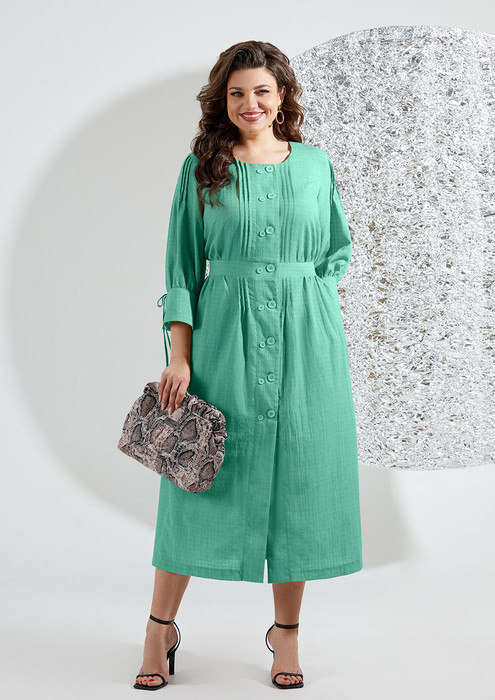 Легкое, летнее платье полу-прилегающего силуэта, выполнено из хлопковой ткани, на хлопковой подкладке. Лиф платья отрезной по линии талии, с защипами по лифу и широким, притачным поясом из основной ткани. Горловина платья округлой формы, на подкладке, застежка по переду на петли-пуговицы, пуговица большая-функциональная, маленькая-декоративная. Юбка платья расклешенного силуэта, присборена по линии талии, спинка идентична полочке, с отрезным поясом по линии талии, на резинке, в боковых швах обработаны карманы.. Рукав втачной, длиной 3/4, по окату застрочены защипы, по низу рукава притачная манжета с разрезами, фиксируется на завязки. Эффектное платье выполненное из натуральной ткани с интересными конструктивными элементами отличный выбор для вас!