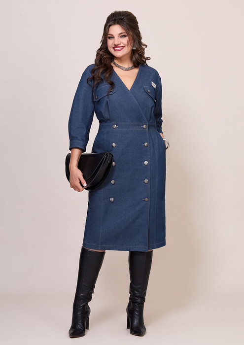 Стильное, женское платье полу-прилегающего силуэта, выполнено из джинса. Лиф платья отрезной по линии талии, горловина V-образной формы, на обтачке, также на полочке обработаны клапаны. Юбка платья прямого покроя, вертикальными подрезами, также на юбке обработана двубортная застежка на петли-пуговицы. Рукав втачной, оптимальной длины, по низу на манжете, с застежкой на пуговицу. Спинка отрезная по линии талии, с втачным поясом, лиф с отрезной кокеткой, юбка также с кокеткой и средним швом. Стильное платье из джинса всегда будет актуальным в любое время года.