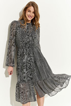 Платье выполнено из вискозного полотна, максимально комфортного и легкого. По переду v-образный вырез горловины и накладной карман с декоративным нашивным элементом. Рукав одношовный, линия плеча слегка спущенная. Спинка разрезная по среднему шву, шов декорирован нашивным элементом. В комплект входит пояс. Длина платья 111 см. Длина рукава от горловины 34.