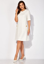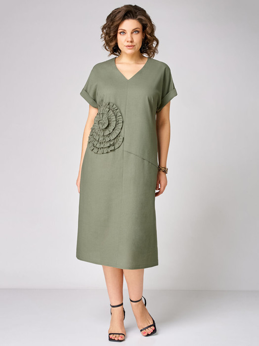 Платье женское   прямого силуэта выполнено из льняной ткани. V-образный вырез горловины. Перед со средним швом, с нагрудными вытачками из бокового шва.  По правой стороне настрочен декоративный элемент в виде цветка.  Спинка со средним швом. Рукав цельнокроеный   с отложной манжетой. Длина изделия по спинке-111см, длина рукава от горловины-29см.