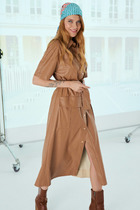 Платье А-силуэта с кулисой по линии талии. В куличу втянута лента, завязывающимися по бокам. В боковых швах - разрезы. Рукав реглан, отрезной в области плеча, с настроченной отделочной тесьмой. По верху нижней части рукава - сборка. Рукав внизу на резинке. Настроченна тесьма. Горловина круглая, с вырезом "капелька" на заявязке изотделочной тесьмы. Платье на подкладке от линии талии.