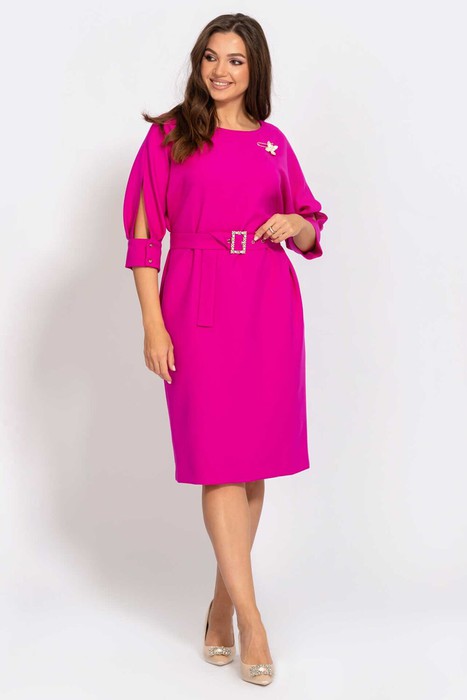 Платье женское полуприлегающего силуэта выполнено из плательной ткани. Горловина круглая. Спинка с застёжкой потайная тесьма молния в центральном шве, который заканчивается шлицей с разрезом. Рукава «летучая мышь», по низу встречные складки и манжет на застёжке две прорезные петли и пуговицы. Платье без подкладки. Дополнением служит пояс с декоративной пряжкой. Брошь в комплект не входит.
