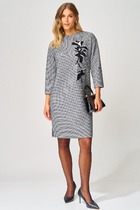 Платье женское свободного силуэта, отрезное по линии талии, расклешённое к низу, выполнено из ткани шифон. По линии талии сборка на резинку «венгерку». Горловина v-образная с небольшими рюшей по переду до линии талии на завязках. Передняя полочка дополнительно украшена рюшами. Рукава одно шовные втачные, по низу легкая сборка. Платье на тонкой трикотажной подкладке с декоративной пришивной тесьмой..