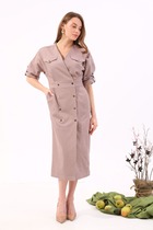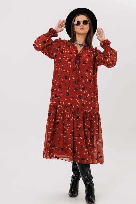 Платье свободного силуэта с подрезом ниже линии бедер. Перед с кокеткой. Горловина обработана рюшей и завязками. Рукав одношовный, заканчивающийся манжетой на венгерке. По окату рукава сборка. Платье на подкладке. Дополняет модель пояс.