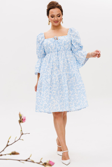 Платье женское отрезное выше линии талии, свободное.  Центральная часть спинки стянута на резинку «венгерку». Горловина фигурная, регулируется завязками. Окаты рукавов стянуты на тонкую резинку. Рукава одношовные втачные, на уровне локтевого сгиба рукав стянут резинкой «венгеркой». Платье без подкладки.