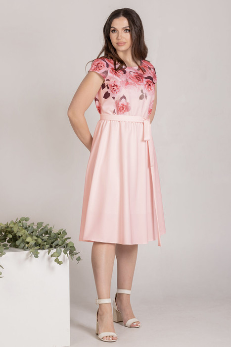 Платье женское, отрезное по линии талии, на резинке, с поясом, со спущенными плечами. Перед в размерах 50,52,54 -- с нагрудными вытачками, исходящими из боковых швов. Спинка со средним швом, застёжкой на петлю-пуговицу. Горловина круглая. Нижняя часть изделия на подкладке.