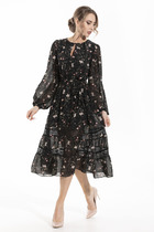 Платье женское полуприлегающего силуэта, выполнено из ткани шифон. Платье на трикотажной тонкой подкладке с широким воланом. По переду кокетка со сборкой и имитация застёжки с декоративными пуговицами. По линии талии кулиса с продетым тонким поясом с наконечниками. Спинка с центральным швом и застёжкой на воздушную петлю и пуговицу. Горловина круглая. Рукава одношовные втачные , по низу резинка.