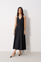 Платье женское А-силуэта, круглая горловина окантована и плавно переходит в заявязку на спине. Спинка со средним швом, у горловины разрез. Рукав втачной , одношовный. Низ рукава на резинке и регулируется завязками. Платье на подкладке.