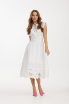 Нарядное платье, выполненное из крепа на трикотажной основе с тоненькой нитью люреска (тянется). Платье А-силуэта. Спинка со средним швом. Горловина округлой формы, обработана окантовкой. Рукава втачные, одношовные, расширенные к низу. Платье декорировано съемным цветком на булавке (цветок может отличаться от фото). Платье без подкладки.