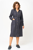 Платье женское полуприлегающего силуэта, выполненное из двух видов ткани: мягкого трикотажного полотна с принтом «Зебра» и плательной ткани «Замша», которые немного тянутся. По переду и спинке отрезной бочок, накладной карман. По боковым швам низ платья со шлицами и отделочными пуговицами. По спинке средний шов. Горловина переда – «Лодочка», по спинке – округлая, переходящая в линию кокетки. Срезы горловины обработаны отделочными кантами. Рукава втачные, одношовные. Платье без подкладки.