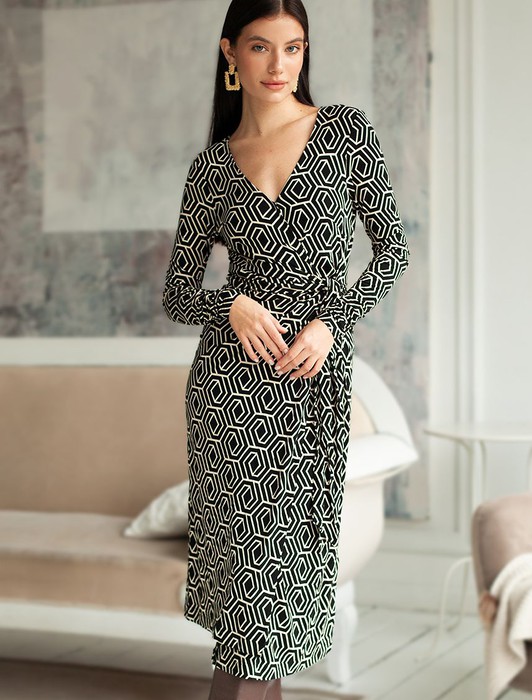Состав: 95%Вис 5%ПУ Параметры модели на первом фото: Рост 172, бюст 81, талия 59, бедра 88Платье на запАх сшито из трикотажной вискозы с эластаном. V-вырез с мини-копкой на борте с внутренней стороны для фиксации выреза декольте. Запах сходится и завязывается на боковой-пояс ленту. Модель подчеркивает достоинства и изгибы фигуры. А геометрический принт скрывает любые неровности. Роскошь и комфорт, одновременно подчеркивающие стиль, женственность и красоту.