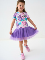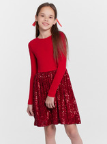 Платье нарядное для девочки полуприлегающего силуэта с втачными короткими рукавами. Платье отрезное по линии талии, полочка и рукава выполнены из ткани с пайетками, юбка пышная с 2-мя слоями сетчатого фатина на подкладке, верхний слой юбки декорирован по