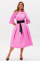 Эффектное двубортное платье длиной миди из облегчённого денима полуприлегающего силуэта. Линия плеча приспущена, рукав втачной три четверти с манжетой и патой. Горловина обработана обтачкой с  V-образным вырезом. Линия талии акцентирована притачным поясом. Имеются карманы в боковых швах. Изделие застёгивается на кнопки. Без подкладки.