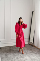 Эффектное двубортное платье длиной миди из облегчённого денима полуприлегающего силуэта. Линия плеча приспущена, рукав втачной три четверти с манжетой и патой. Горловина обработана обтачкой с  V-образным вырезом. Линия талии акцентирована притачным поясом. Имеются карманы в боковых швах. Изделие застёгивается на кнопки. Без подкладки.