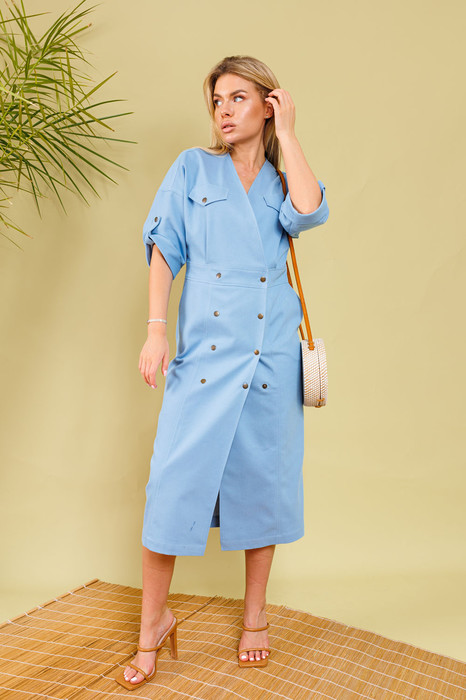 Эффектное двубортное платье длиной миди из облегчённого денима полуприлегающего силуэта. Линия плеча приспущена, рукав втачной три четверти с манжетой и патой. Горловина обработана обтачкой с V-образным вырезом. Линия талии акцентирована притачным поясом. Имеются карманы в боковых швах. Изделие застёгивается на кнопки. Без подкладки.