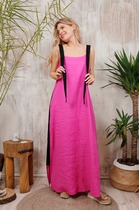 Эффектное двубортное платье длиной миди из облегчённого денима полуприлегающего силуэта. Линия плеча приспущена, рукав втачной три четверти с манжетой и патой. Горловина обработана обтачкой с V-образным вырезом. Линия талии акцентирована притачным поясом. Имеются карманы в боковых швах. Изделие застёгивается на кнопки. Без подкладки.