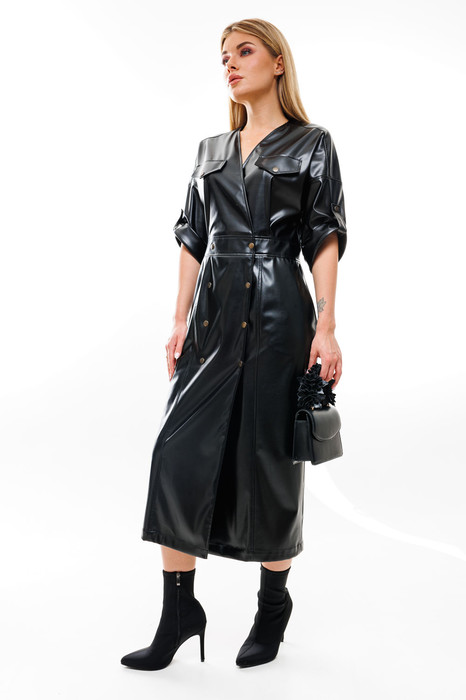 Эффектное двубортное платье длиной миди из экокожи на хлопковой основе полуприлегающего силуэта. Линия плеча приспущена, рукав втачной три четверти с манжетой и патой. Горловина обработана обтачкой с  V-образным вырезом. Линия талии акцентирована притачным поясом. Имеются карманы в боковых швах. Изделие застёгивается на кнопки. Без подкладки.