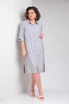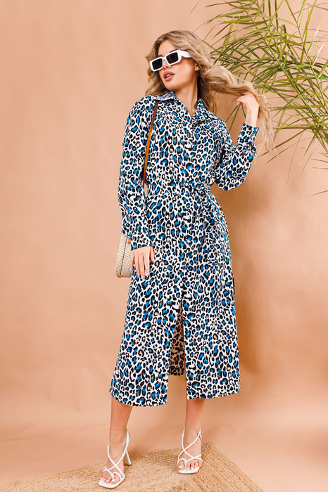 Изящное платье - рубашка прямого кроя из вискозного полотна с акцентным принтом. Горловина обработана рубашечным воротником с отрезной стойкой. Модель со слегка приспущенной линией плеча и длинным рукавом с манжетами. Длину рукава можно регулировать с помощью пат. Застёжка центральная на петли и пуговицы. По боковым швам расположены карманы. По низу изделия разрезы. В комплект входит пояс из основной ткани.