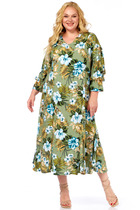 Платье длиной миди, отрезное по линии талии.По переду нагрудные вытачки переведены в талиевые. Лиф спинки со средним швом, талиевыми и плечевыми вытачками. Юбка со складками на линии талии, расширена к низу. В среднем шве спинки застежка на потайную молнию. Горловина обработана обтачкой. Рукава широкие, втачные,одношовные. По окату рукава заложены мягкие складки. Нижний срез рукава со сборкой, обработан бейкой. Карманы в боковых швах. Рукава и часть лифа платья декорированы кружевной сетчатой тканью с пайетками.