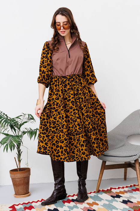 Комбинированное платье А-образного силуэта, отрезное по линии талии. Лиф изделия выполнен из трикотажной ткани, рукава и юбка - плательной. По переду и спинке вертикальные рельефы. Рукав втачной, низ рукава оформлен резинкой. Воротник - стойка. Застежка на тесьму -молнию, расположенную по центру переда и на воротнике. Изделие без подкладки.
