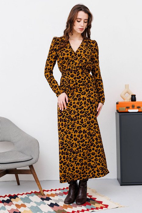 Элегантное платье приталенного силуэта, слегка расширенное к низу. Отрезное по линии талии. На деталях переда и спинки отрезные кокетки. На детали переда средний шов. По верхнему краю и на участке талиевого шва деталей переда и спинки выполнена сборка. Вырез горловины V-образной формы. На детали нижней части переда и спинки талиевые вытачки. Рукав длинный, втачной. Застежка платья на потайную молнию в боковом шве.